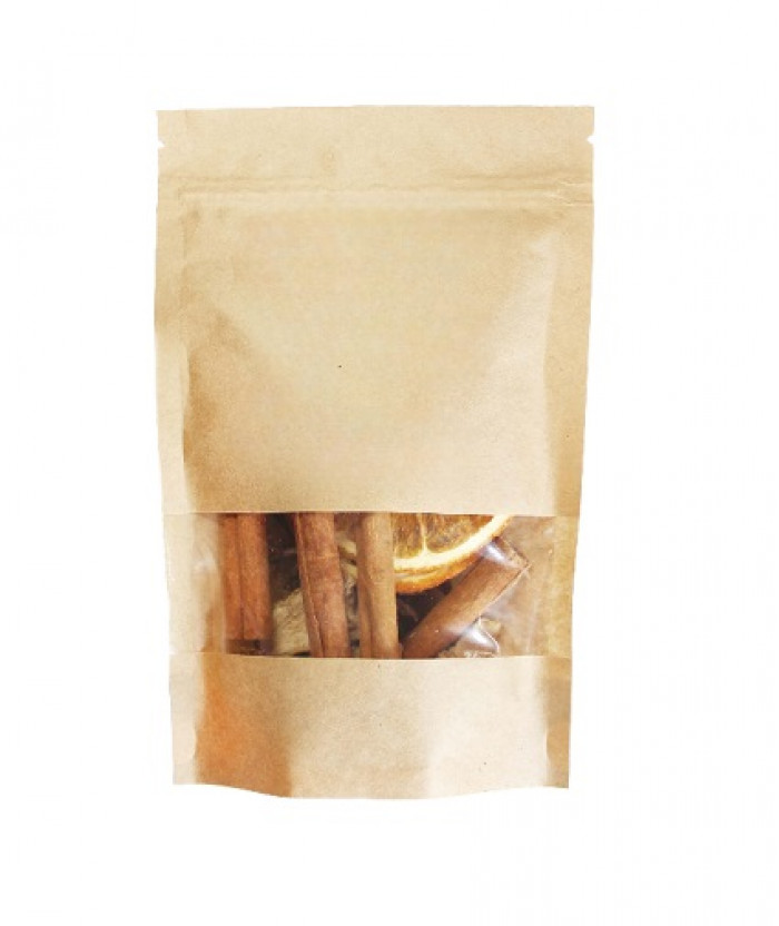 Mulled Wine Mix, 44.8 g (in Kraft Packaging) – a carefully selected blend of spices for creating aromatic and warming mulled wine. The mix includes: cinnamon sticks, whole allspice, sliced ginger, star anise, cardamom seeds, whole cloves, and dried sliced orange. This blend differs from the standard 23 g mulled wine mix by doubling the amount of each ingredient, providing a richer taste and aroma.